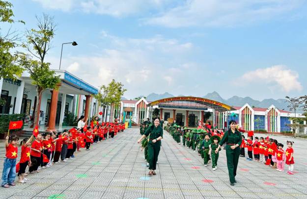 Mở đầu chương trình là hoạt động diễu binh, diễu hành đầy ấn tượng. Tham gia diễu binh, diễu hành là các bé khối 45 tuổi và 56 tuổi trong vai những chú bộ đội, mặc trang phục bộ đội, hành quân từ ngoài cổng trường tiến vào khuôn viên trường. Đi phía sau đoàn bộ đội là đoàn dân công hỏa tuyến chở lương thực tiếp tế cho tiền tuyến. Hai bên đường, các bé khối nhà trẻ, khối bé cùng cán bộ, giáo viên, nhân viên nhà trường đứng vẫy cờ hoa, nồng nhiệt chào đón các chú bộ đội trong không khí trang nghiêm, xúc động và đầy tự hào.