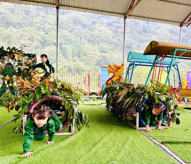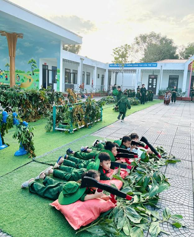Không khí buổi trải nghiệm càng trở nên hào hứng hơn khi các chú bộ đội nhí bước vào luyện tập thao trường và Tại thao trường trải nghiệm, các bé tham gia các nội dung như: tập bắn súng mô phỏng, leo trèo, trườn bò vượt chướng ngại vật đơn giản. Những hoạt động này không chỉ mang lại niềm vui, sự hào hứng cho trẻ mà còn góp phần rèn luyện thể lực, sự khéo léo, dẻo dai và tinh thần dũng cảm.